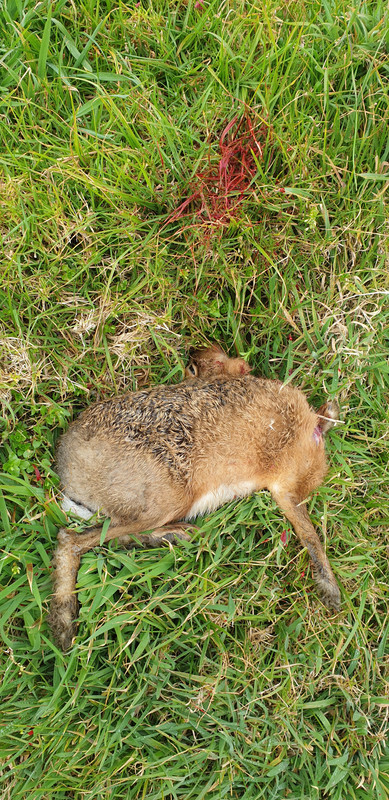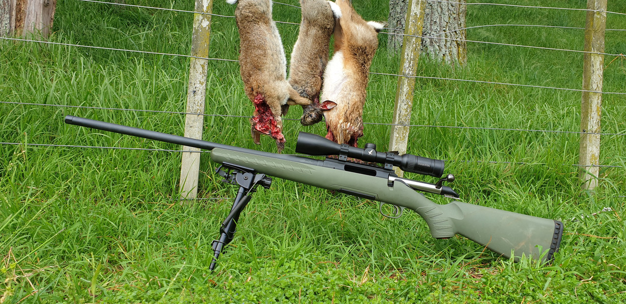 After waiting all week finally got a fine (ish ) morning to take the little Ruger .243W out on a walk looking for Rabbits and Hares. Left home a bit later than I wanted to but it was a blustery and overcast morning and I haven't troubled the varmints there for a few weeks so guessed they might still be out feeding. Sure enough, several were but the wind make them jittery and a couple or three busted away as I sneaked in. But not far on, around a corner I spied a Rabbit sitting in the open. 154 yds is quite doable for the Ruger and a headshot was executed. Nice. Next I spooked another pair away ( bugger ) so carried on and sneaked into about 20 yards of a feeding Hare before it spied me just as I was squeezing the trigger and got clean away. The next Rabbit had no idea I was there. Sitting at the burrow entrance I'm sure it's eyes were closed. 142 yards, slightly uphill. Bang, and down. Last one was a feeding Hare that was hard to keep up with. It would take a mouthful and hop, mouthful and hop etc. etc and I shifted several times to keep the scope on it. I sort of kept slight tension on the trigger and next time it stopped broadside I neck shot it. 47 yards, good job. I love shooting those Hornady VMax 87 gn bullets. Accurate as anything and they open explosively. Not much ever survives a hit. After seeing the varmints I did I need to get back there again, soon.