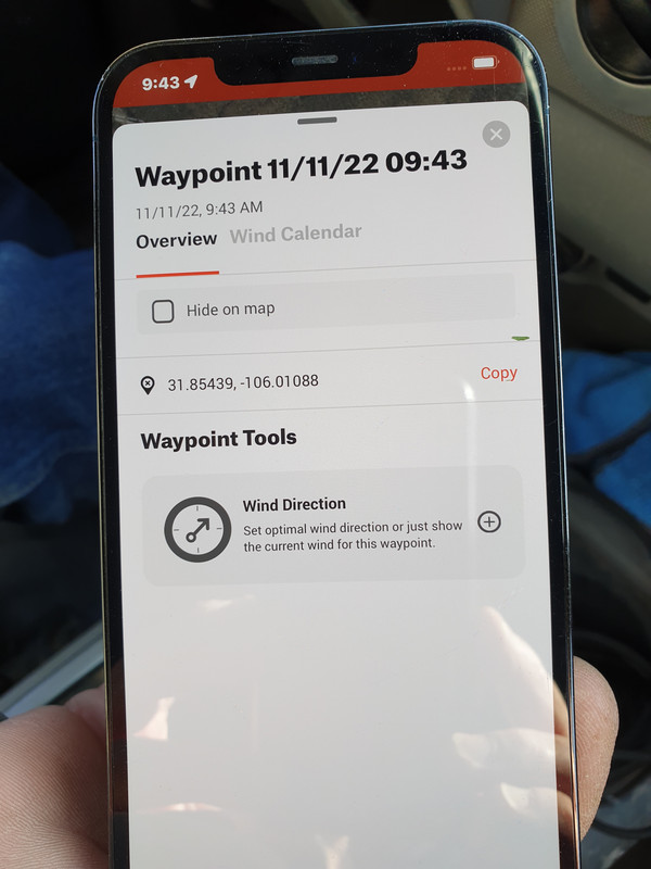 The pic shows location coordinates on a cellphone app of a countryside spot in the USA, near El Paso, Texas.