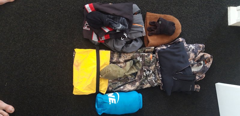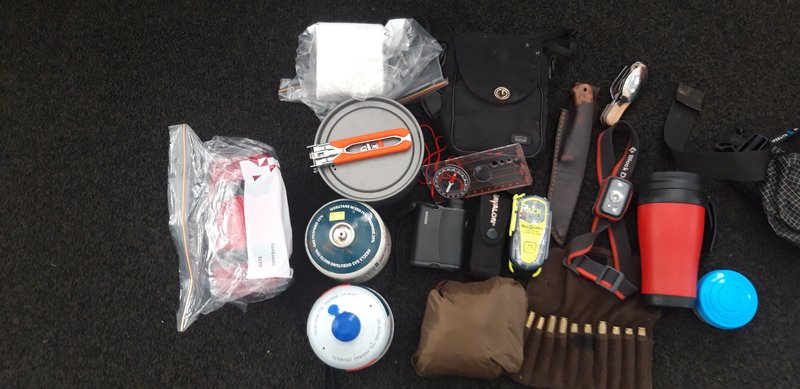 Next is my kit. pot has cooker and lighter and spoon inside it. Spare ammo ,rain jacket, gas. Usually id carry 1 canister, but I have a half full one I want to use up. Rangefinder, coffee, compass and bino's, epirb, TP and first aid kit. The cup has soap, toothpaste and brush inside it as well.