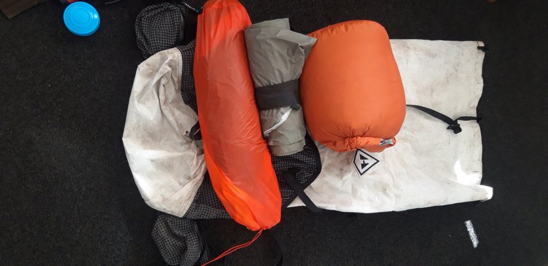First up the real important stuff. Pack, tent, sleeping bag and mat. Pack is a hyperlite mountain gear 70 litre and weighs 1.1 kg. the tent is a Kuiu summit refuge 3 person. I really like it for its weight and room, and multiple ways it can be erected. IE walking pole, saplings, or rope. It comes in at less than 900grams.