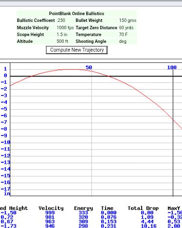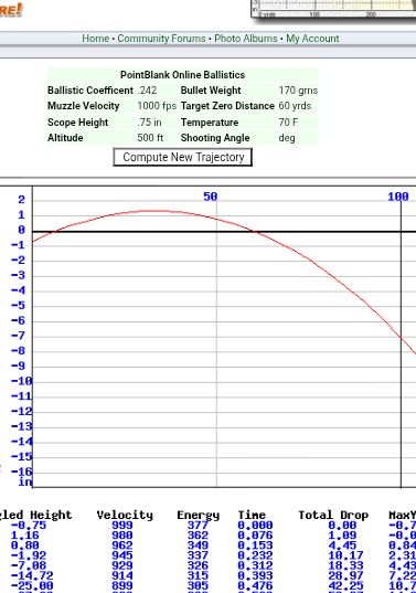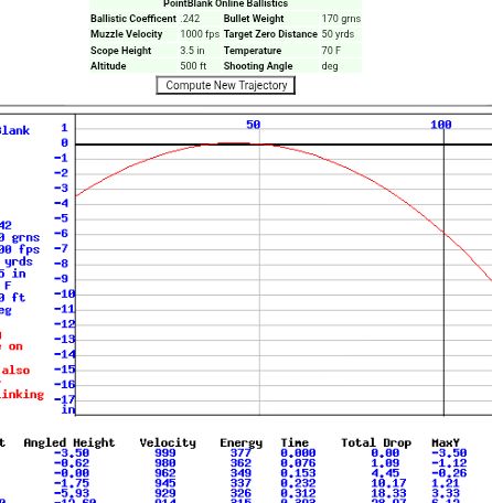 . I was thinking more of moving the zero point so where the procjectile passes through on the way up is closer to the 50 or 60m mark rather than the 20m mark even if it just peaks at or over that zero rather than higher. It will still fall drasticly, the same as my 303 with a 215RN does at 300. (2050fps at muzzle...zero at 50m 2" high at 100m, zero again at about 130 and falls like a stone to 38" low at 300m....)